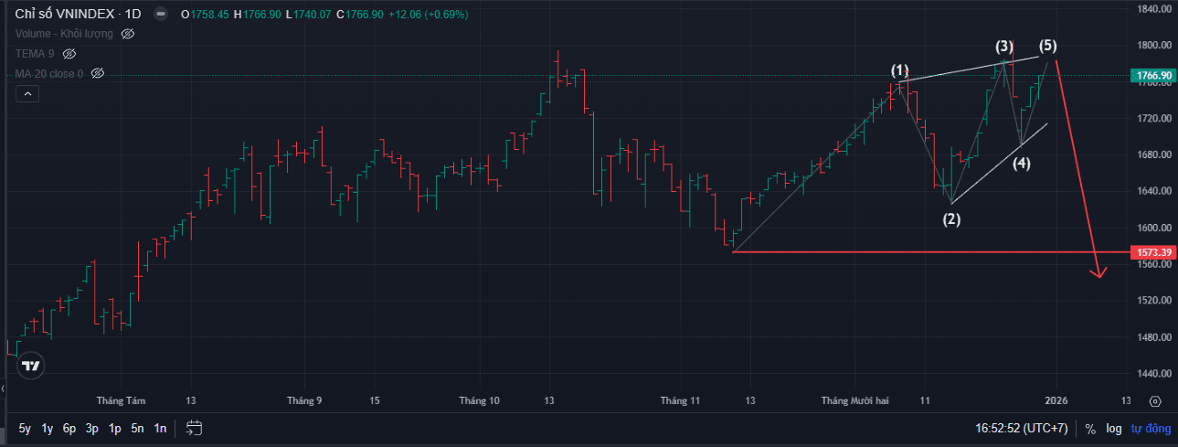 VN-Index đang tăng theo mẫu hình Wedge, theo sóng elliott là mẫu hình Ending Diagonal. Nhiều cổ phiếu đã tiến vào giai đoạn phân phối. NĐT nên thận trọng trước khả nang giảm mạnh của con sóng theo sẫu mẫu hình ED.