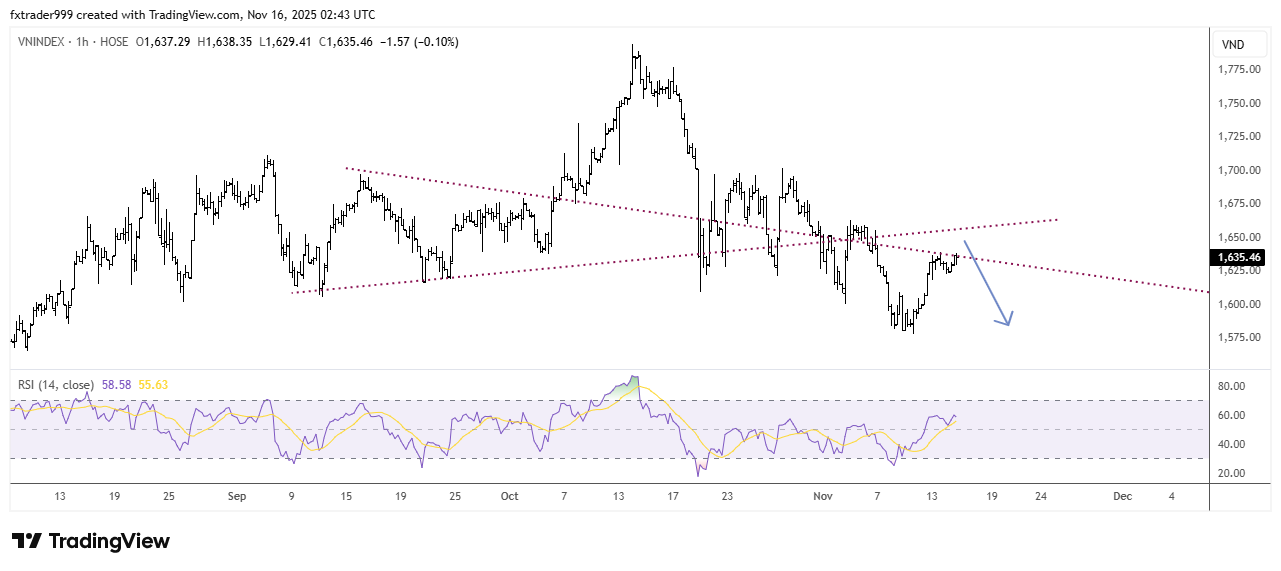 VNINDEX đang nỗ lực trong tuần qua. Chỉ số đang reset lại khu vực đỉnh apex của mẫu hành tam giác. Hiện tại VNINDEX đang hiện tại là nhịp hồi phục chỉ thuật A-B-C với sóng C đang phát triển. Vùng 1640-1445 sẽ là cản do chỉ số.