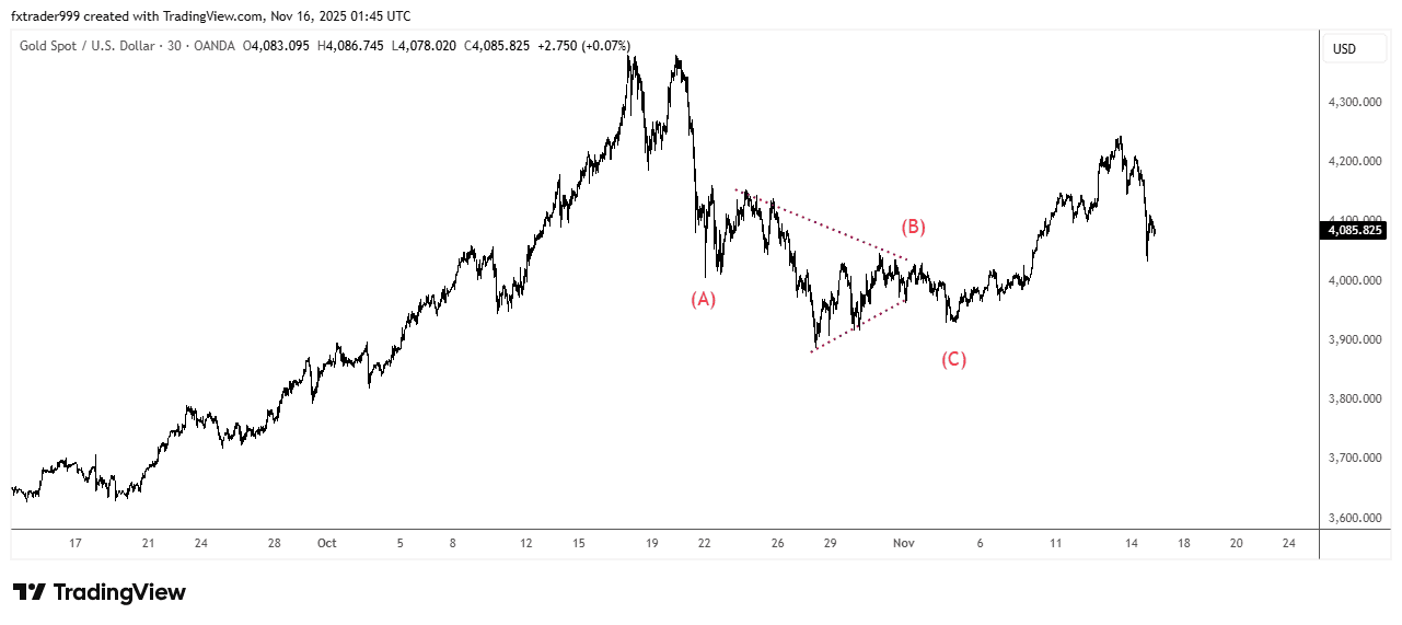 Giá vàng giảm mạnh từ 4211. Hiện tại giá đang ở sóng 3 của năm sóng giảm đầu tuần giá có thể quay lại đáy cũ để hoàn thành sóng 5. Sau đó sẽ hồi phục theo dạng a-b-c.
