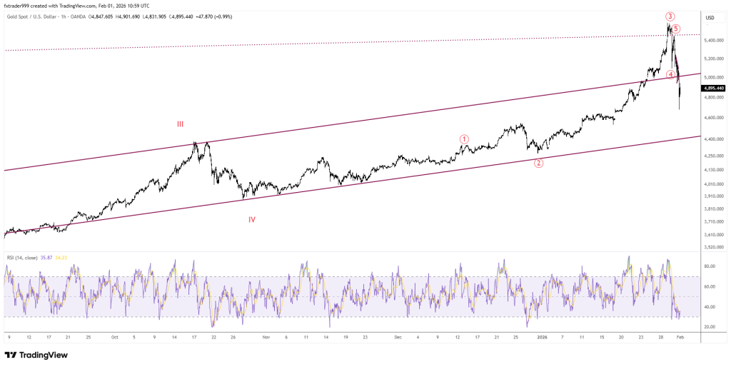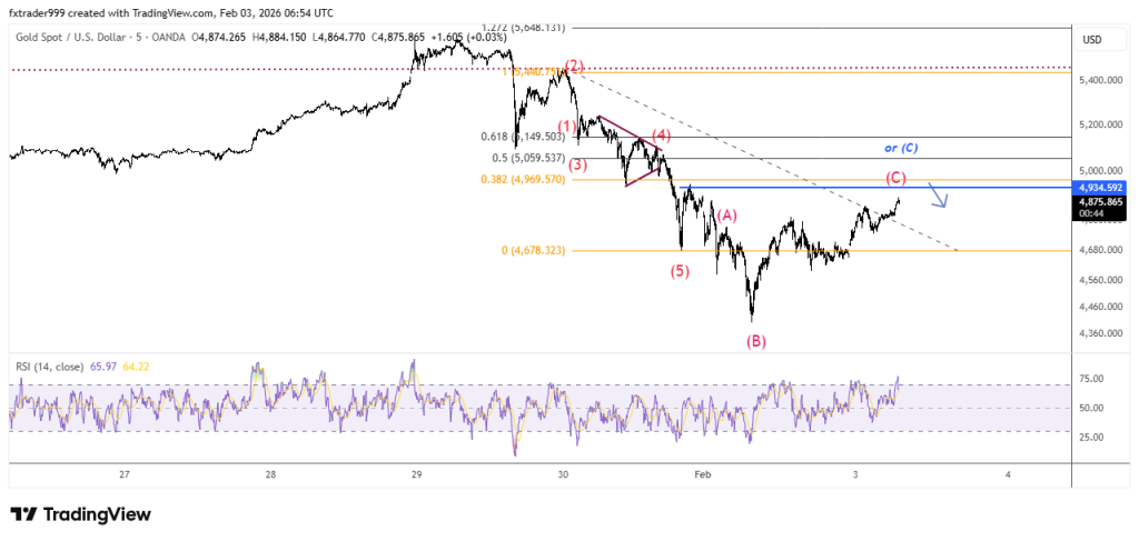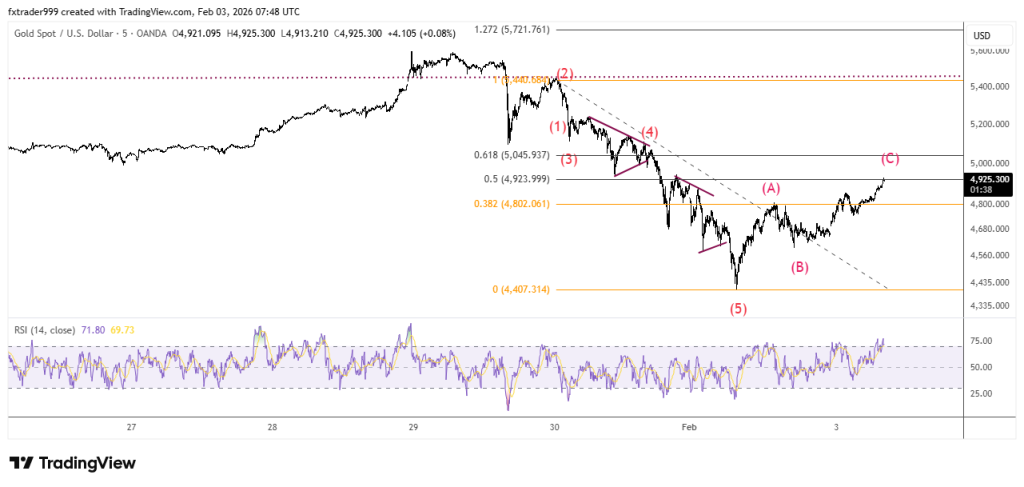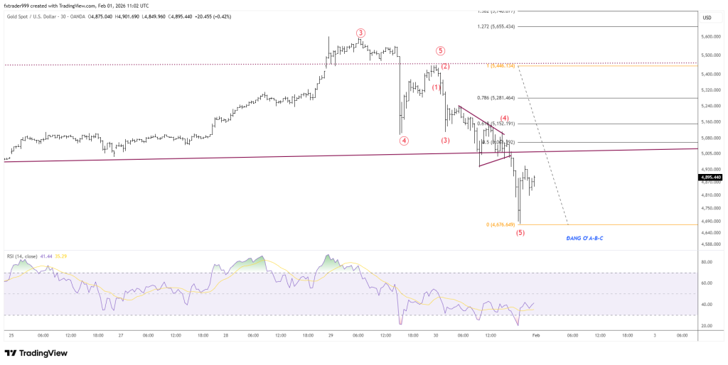 XAUUSD đang mở ra chân sóng-leg C của mẫu hình sóng chỉnh A-B-C, sóng C vẫn đang phát triển, chưa thể xác nhận kết thúc nhưng vùng dự kiến từ 4915-4970 USD/oz. Quan điểm đầu tư của admin là canh Sell theo sóng giảm lớn. Để có bức tranh sóng lớn, đọc giả vui lòng xem chi tiết cách đếm sóng ở các chart bên dưới. Admin cho rằng vàng còn dư địa giảm, NĐT tranh mua vàng vật chất ở thời điểm hiện tại.