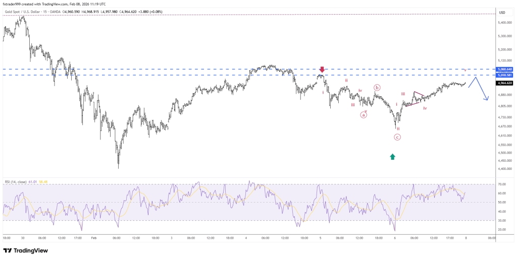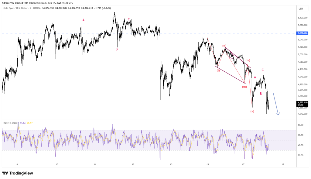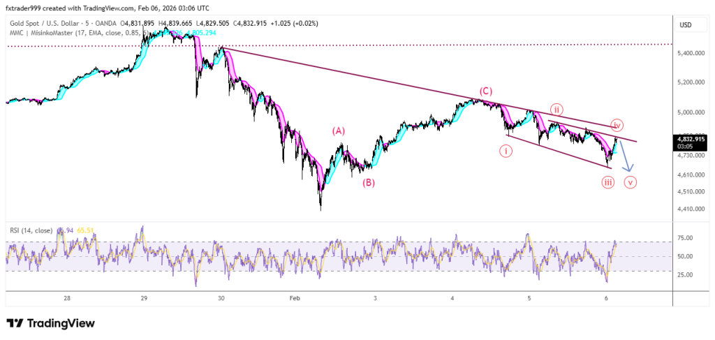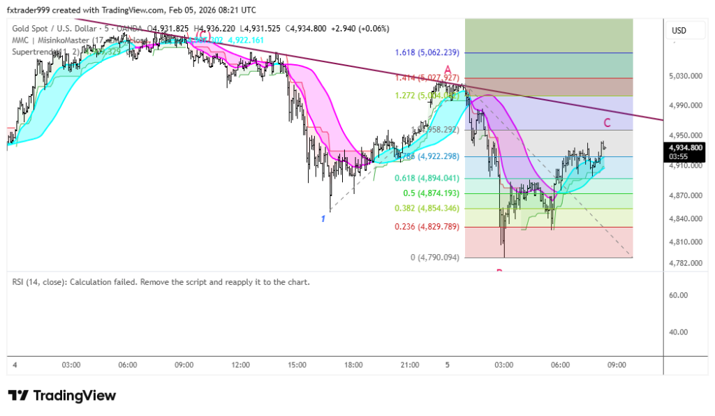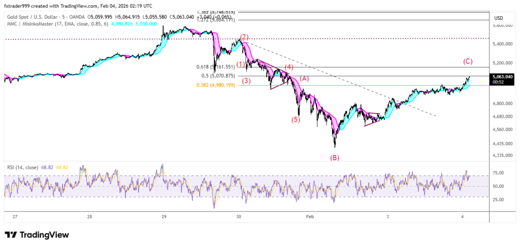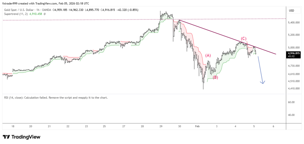 XAUUSD đã kết thúc sóng hiệu chỉnh A-B-C tại vùng 5092, đang bắt đầu series sóng giảm 1-2-3-4-5. Sell ở nhịp hồi, điểm sai khi giá vượt 5000(05/02/2026)
