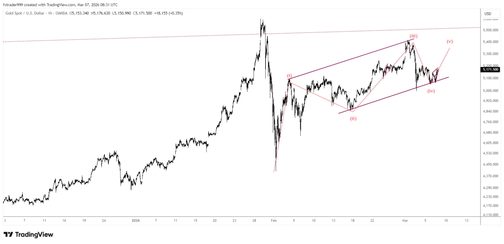 Cấu trúc giá vàng giao ngay Spot Gold đang hé mở dạng Diagonal, XAUUSD vẫn còn dư địa của nhịp lên lại quanh sóng iii vùng 5400 để hoàn thành sóng v.
